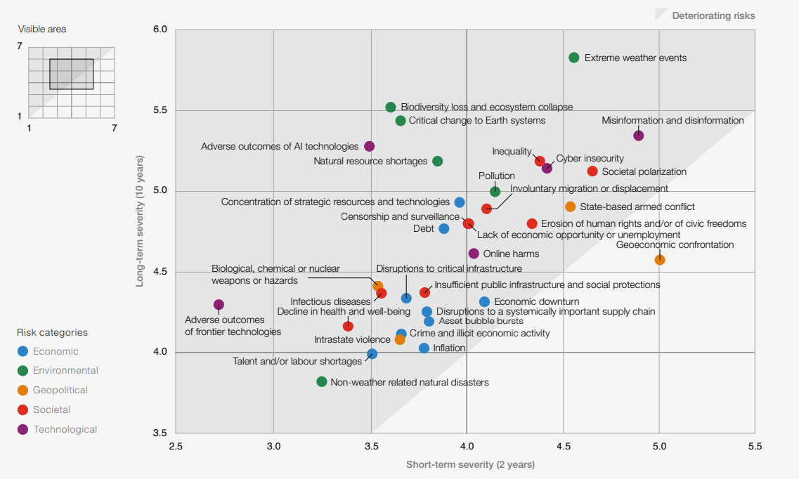 Water will intensify as a sovereign risk and national security threat. 1.8 billion people face absolute water scarcity, with population growth and urbanisation in Latin America and Asia increasing demand for hydropower dams. However, there lacks legislation and framework on water governance – which armed groups can leverage to decimate and control populations and worsen conflicts (e.g. Sahel jihadist group in West Africa).