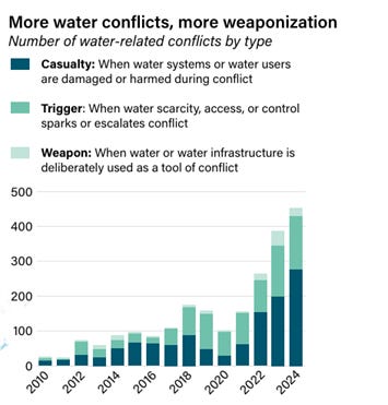 Why is it important? Water use and scarcity are particular vulnerable due to climate change, but now even more so as a result conflict and lack of social cohesion. The number of water-related conflicts has increased exponentially since 2010 as has the number of casualties harmed (please see image below).